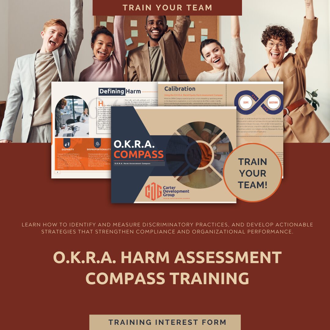 The O.K.R.A. Harm Assessment Compass provides a structured, measurable framework to audit your policies, programs, and practices. The OKRA Compass framework pinpoints disproportionality, underutilization, access barriers, and systemic disadvantages with data-driven clarity.